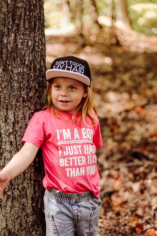 Our DON'T TOUCH MY HAIR Snapbacks are available in Toddler, Youth, and Adult Sizes.